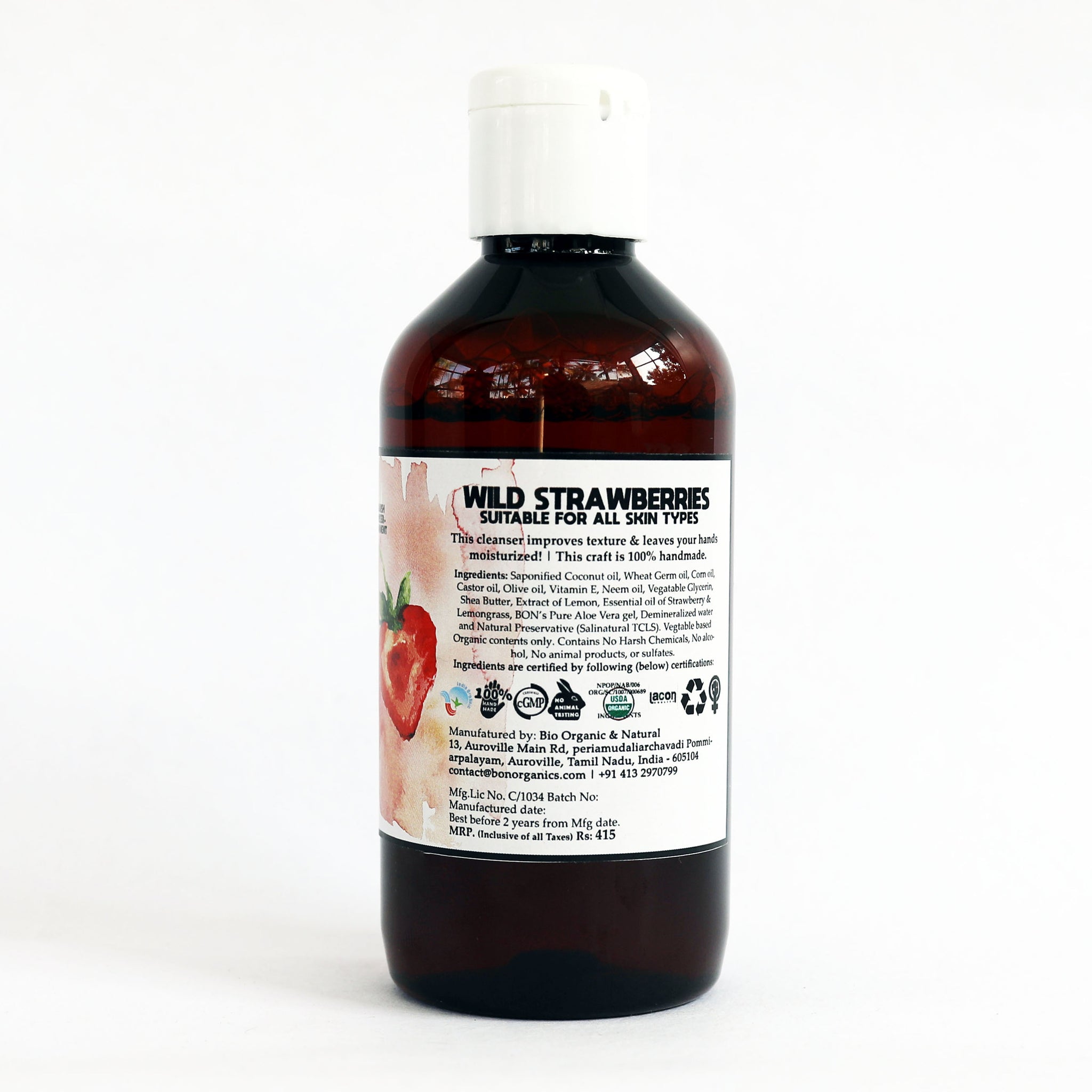 Ingredients: Saponified Organic Coconut oil, Wheat germ oil, Organic corn oil, Organic Caster oil, Olive oil, Organic Neem oil Vitamin E, Glycerine, Shea butter, Essential oil of lemongrass, fine fragrance of strawberry, Aloe Vera gel, & Demineralised water. Vegetable based Organic contents only. Contains No Harsh Chemicals, No alcohol, No animal products, or sulphates.